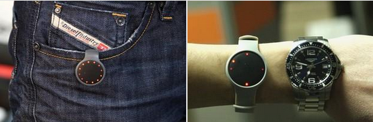 我们再来看追踪器主体:Misfit Flash依然采用圆形设计,并搭载了LED点阵,代表着运动进程和当前时间。Flash追踪器的直径为 28mm,比 Shine多了0.6mm左右。除了前面我们曾提到过的材质上的差异,Misfit Flash的追踪器主体更显扁平化,且新增了物理按键,远比 Shine的敲击式感应更加直接、稳定、快捷。