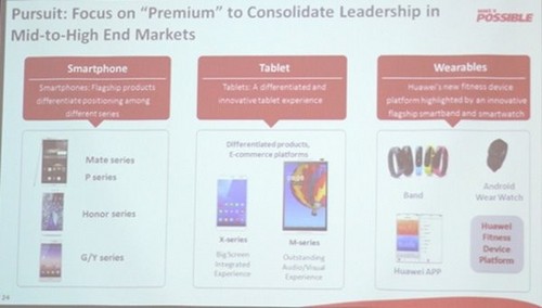 网上曝光了一张华为2015年新品路线图的照片,根据照片上的内容,华为在2015年的手机善品将以中高端为主,继续推出平板电脑,同时更多的涉足智能可穿戴领域。