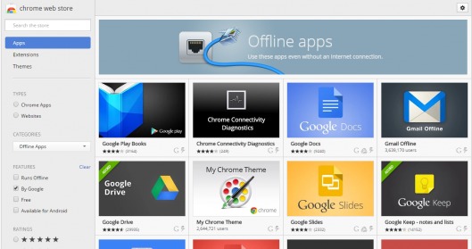 如今有好一些应用程序不需要网络链接就能够离线使用,比如 Gmail 邮箱、谷歌硬盘和谷歌日历。这对那些不能使用网络或经常出差工作的用户来说是理想办公工具。用户可以从 Chrome 应用商店安装离线扩展程序,并使用 Chrome 应用启动器或 Chrome 浏览器来打开这些程序。