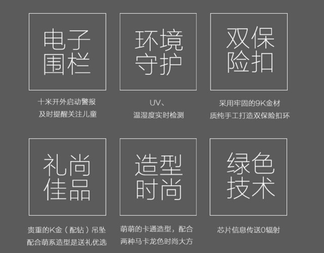 该设备提供相关APP,采用蓝牙4.0连接,具备“电子围栏”功能,即当孩子走离超过10米便自动报警,能及时发现儿童走远。另外,它还能实时检测UV、温湿度等环境,及时提供防晒穿衣建议。