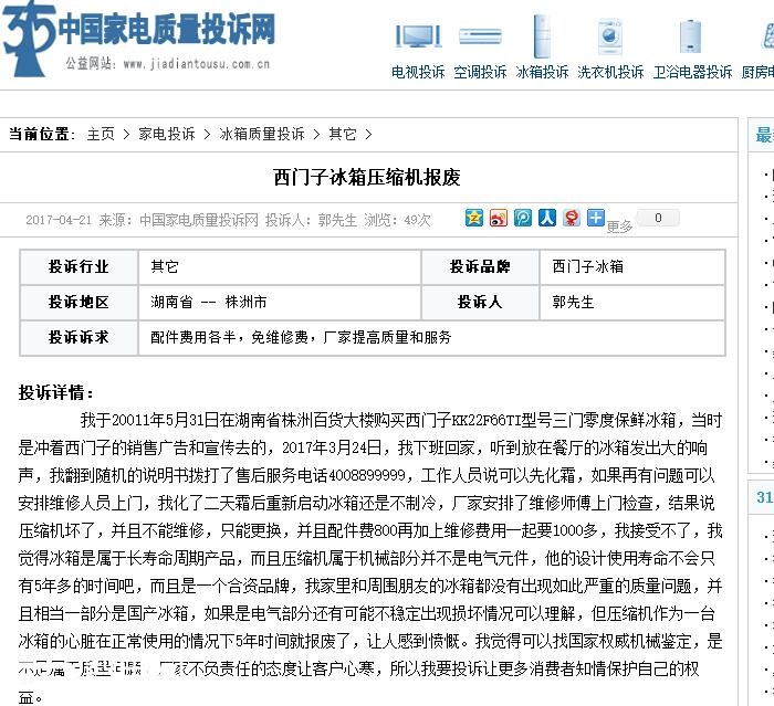 湖南省株洲市的郭先生反映,我于20011年5月31日在湖南省株洲百货大楼购买西门子KK22F66TI型号三门零度保鲜冰箱,当时是冲着西门子的销售广告和宣传去的,2017年3月24日,我下班回家,听到放在餐厅的冰箱发出大的响声,我翻到随机的说明书拨打了售后服务电话4008899999,工作人员说可以先化霜,如果再有问题可以安排维修人员上门,我化了二天霜后重新启动冰箱还是不制冷,厂家安排了维修师傅上门检查,结果说压缩机坏了,并且不能维修,只能更换,并且配件费800再加上维修费用一起要1000多,我接受不了,我觉得冰箱是属于长寿命周期产品,而且压缩机属于机械部分并不是电气元件,他的设计使用寿命不会只有5年多的时间吧,而且是一个合资品牌,我家里和周围朋友的冰箱都没有出现如此严重的质量问题,并且相当一部分是国产冰箱,如果是电气部分还有可能不稳定出现损坏情况可以理解,但压缩机作为一台冰箱的心脏在正常使用的情况下5年时间就报废了,让人感到愤慨。我觉得可以找国家权威机械鉴定,是不是属于质量问题,厂家不负责任的态度让客户心寒,所以我要投诉让更多消费者知情保护自己的权益。