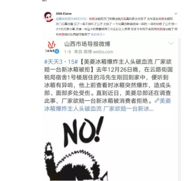 而在微博上,吐槽美菱冰箱质量问题的消费者更多。化霜溶断器一年维修三次、冰箱直接爆炸导致消费者受伤……类似的质量问题比比皆是,美菱冰箱的质量已成为了大问题。