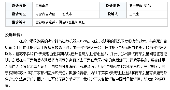 据内蒙的王先生反映,其在苏宁易购购买的海尔蜂鸟扫地机器人f300g,在初次试用的情况下发现噪音过大,与商家广告机宣传上所描述的最高上限噪音50db不符,由于苏宁易购平台上标注的可7天无理由退货,故与苏宁易购联系。