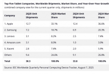 发布时间:2025年08月22日根据IDC的数据,三星在2025年第二季度共发货720万台Galaxy Tab设备,使其成为安卓平板电脑市场的领导者。国际数据公司 (IDC) 已经发布了关于2025年第二季度全球平板电脑出货量的分析。根据该分析,三星在2025