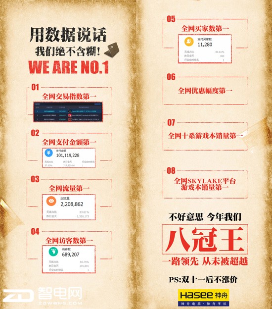 去年的双十一,神舟就作为笔记本电脑行业唯一一个破亿的电脑品牌,全网销售额达到1.5亿,今年的神舟再创奇迹,全网销售额破2亿,不仅蝉联冠军,而且遥遥领先其他友商。打破历年纪录的同时,更是创造笔记本界神话,双十一单天,甚至仅神舟天猫店支付金额就突破1亿元,怎能说不是奇迹?