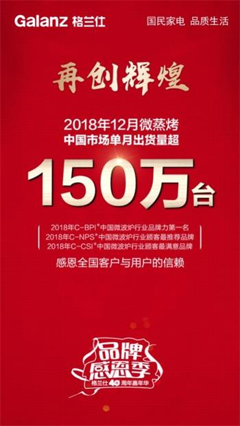 2018年12月底,“国民家电”格兰仕传出捷报,2018年12月,格兰仕微蒸烤类生活电器中国市场出货量超过150万台,相比去年同期大涨25%,显示出国人强劲的消费升级需求。
