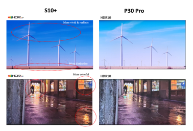 另一方面,三星Galaxy S10、S10+的屏幕分辨率为2K+,支持HDR10+显示技术、亮度800nit、0.4JNCD的色准,使其成为目前业内色准最高的屏幕。而华为P30 Pro仅支持HDR10显示,且同一测试环境下屏幕亮度也仅为617nit。但早在4年前,三星Galaxy S6就已支持600nit的屏幕亮度,此次的S10+更比上一代S9+的700nit还提升了14%,三星创新升级的实力可谓给足了用户惊喜。