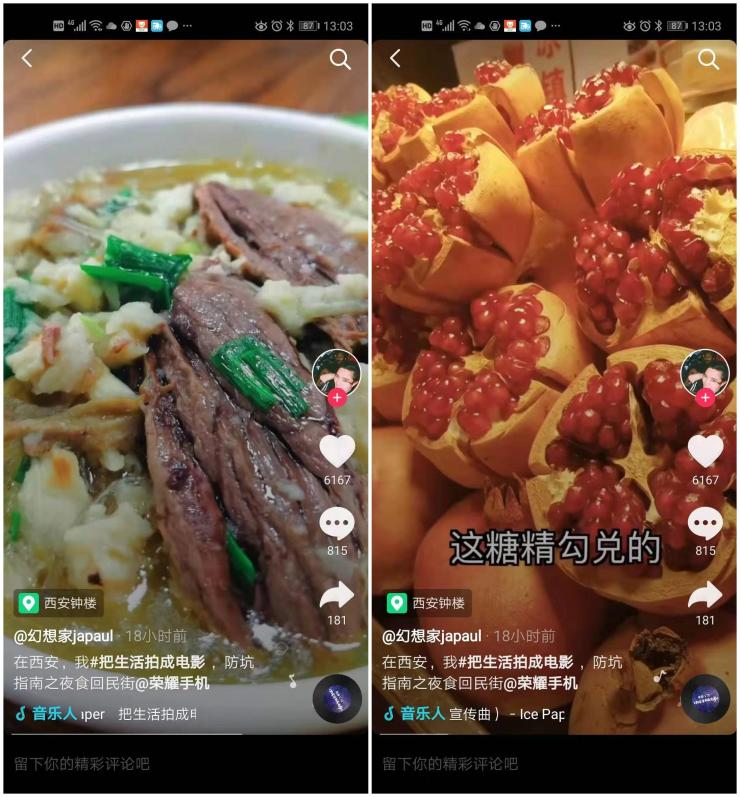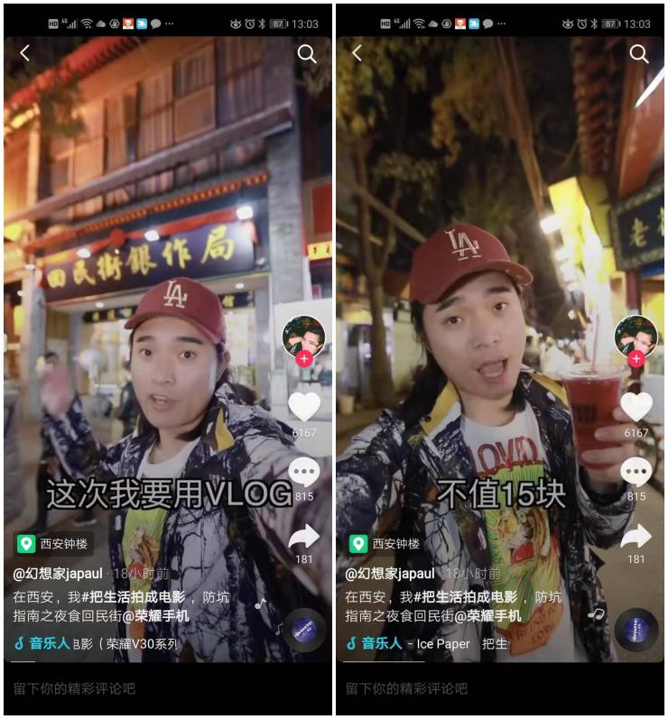 截止到目前,抖音APP上的#把生活拍成电影 话题下面已经有非常多的参赛作品。其中抖音用户@幻想家japaul 借助荣耀V30在西安拍摄出了非常精美的夜景Vlog。根据@幻想家japaul的视频可以看到,西安回民街的夜景光线比较暗淡,现场环境也比较复杂,普通手机很难拍出满意的效果。