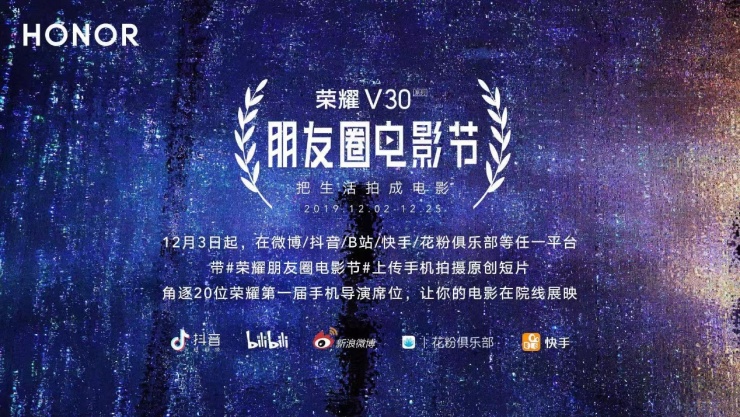 荣耀朋友圈电影节启动仪式于12月2号举办,此次朋友圈电影节将面向所有手机用户,感兴趣的可以在活动期间,通过抖音、B站、微博、快手、花粉俱乐部几大平台,通过带#荣耀朋友圈电影节#话题或标签发布作品参与活动。