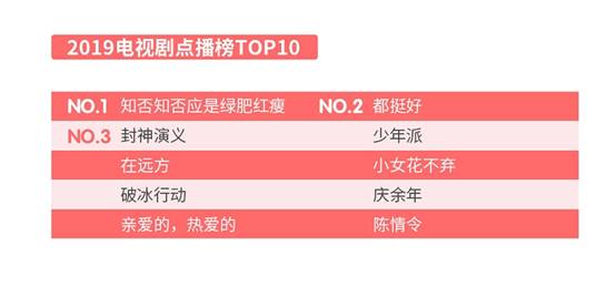 2019年,电视剧点播TOP10分别为《知否知否应是绿肥红瘦》、《都挺好》、《封神演义》、《少年派》、《在远方》、《小女花不弃》、《破冰行动》、《庆余年》、《亲爱的,热爱的》、《陈情令》,电影点播TOP10分别为《哪吒之魔童降世》、《流浪地球》、《战狼2》、《西虹市首富》、《飞驰人生》、《复仇者联盟4:终局之战》、《烈火英雄》、《毒液:致命守护者》、《鼠胆英雄》、《西游记之大圣归来》。
