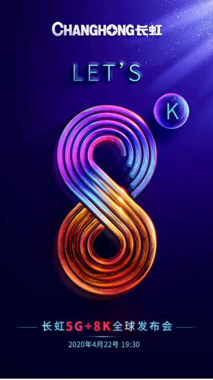 2020年4月22日,长虹电视即将召开2020新品发布会:“长虹5G+8K全球发布会”,据悉,此次发布会,长虹电视将发布其8K全系列新品,长虹电视方面称,此次发布会将用5G速度与8K画质带来的卓越体验,向消费者传递:5G速度看中国,8K电视看长虹,长虹电视,与世界一同迈向8K时代。