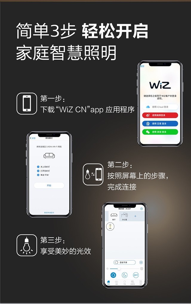 全新飞利浦智能Wi-Fi LED系列产品从研发开始便将安装简便和轻松操控作为核心痛点——Wi-Fi直连,无需桥接器,下载WiZAPP即可轻松上手操控。除此之外,还可连接智能精灵和家居助手,从而实现语音控制。全屋灯光一“应”俱全,每个人都能轻松享受到智慧照明的便利。