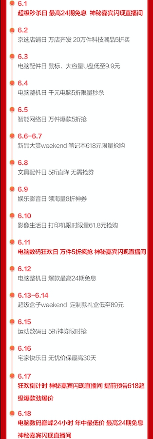 漫长的消费狂欢带来购物疲劳感?6月1日-18日期间,京东电脑数码将每天开启一个品类日专场,超级秒杀日、智能网络日、超级盒子weekend,你想要的数码宝贝随便选,还有专场福利发不停,带你换着花样玩出新鲜!