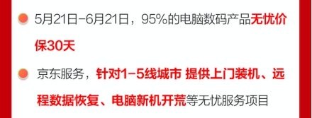 5月21日-6月21日,京东电脑数码超95%的产品都将推出无忧价保30天服务,买贵就退,买贵就赔,坚决不做“冤大头”!另外,京东电脑数码将为1-5线城市提供上门装机、远程数据恢复等服务,服务到底多贴心,你来体验就知道啦。