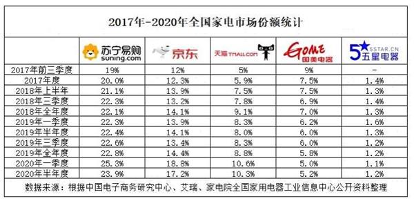 编者整理获悉,自2017年中国电子商务研究中心发的《2017“双11”家电网购前瞻报告》显示,2017年前三季度苏宁易购以19%的市场份额,位列当年行业第一后,截至2020年,苏宁长期以市场份额占比第一的姿态雄踞家电全渠道。