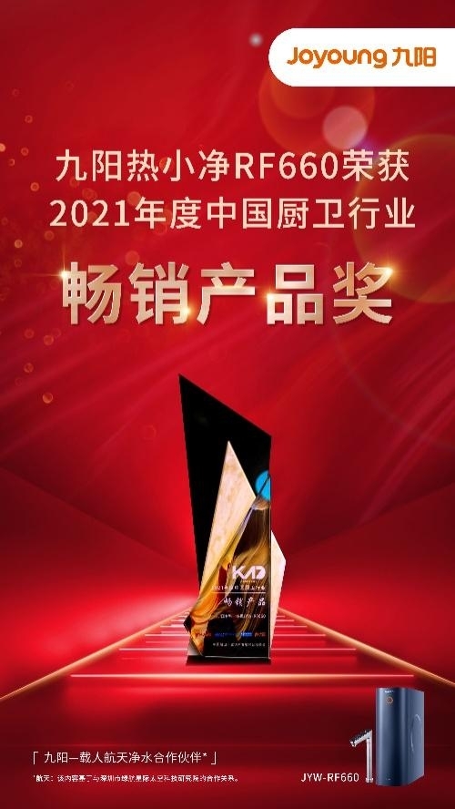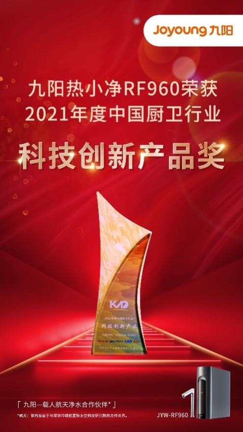 本次峰会,还从用户青睐、市场畅销、科技创新以及品牌影响等层面对相关企业进行颁奖,九阳净水从众多品牌中脱颖而出,荣获 “2021年中国厨卫行业十大影响力品牌”,同时,九阳热小净RF960荣获“2021年度中国厨卫行业科技创新产品奖”,九阳热小净RF660荣获“2021年度中国厨卫行业畅销产品奖”,这是对九阳净水在技术创新、消费者洞察方面的高度认可。