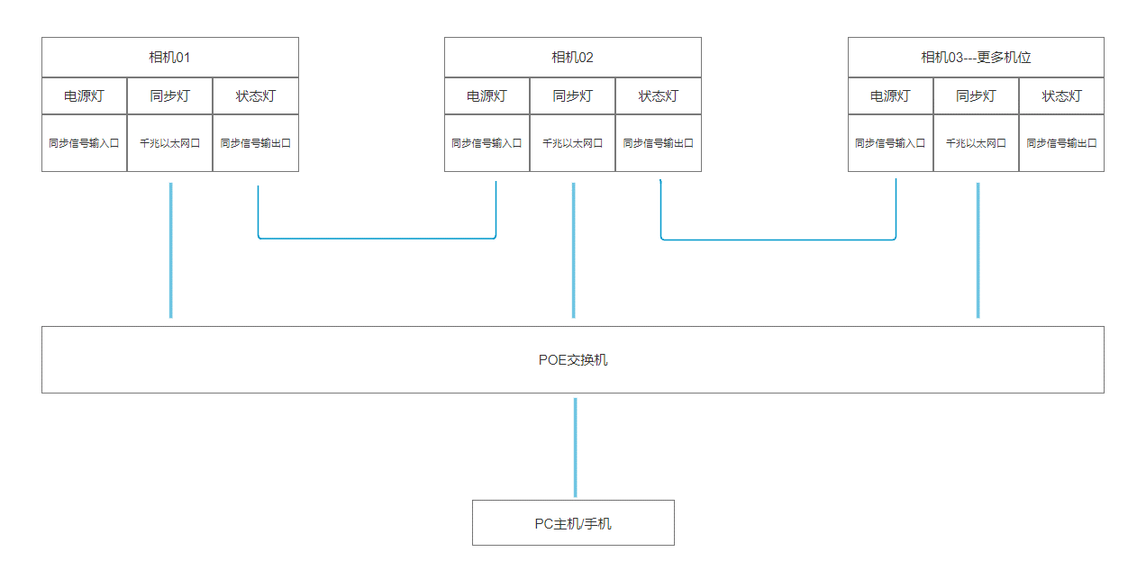 这张图非常简洁明了,所有相机通过同步线进行连接,实现毫秒级的多机同步,再用网线将每台相机连接到PoE交换机上,就能实现数据传输及供电的作用,然后可以通过电脑或者手机连接Wi-Fi对FreeView进行控制,也可以理解为已经进入IP控制的阶段。