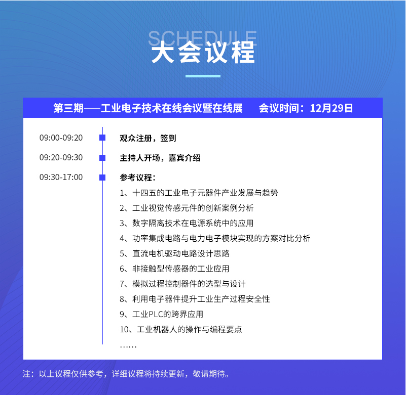 不仅如此,本次会议还邀请了国内外工业电子领域的知名专家、企业家进行技术探究,参考议程如下图所示。