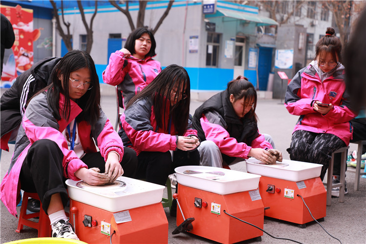 “同学们,请将泥揉成圆团,放在拉坯机中心,双手湿水抱泥……。”2月13日下午,陕西新华的部分班级学生在陶艺教室上起陶艺课。