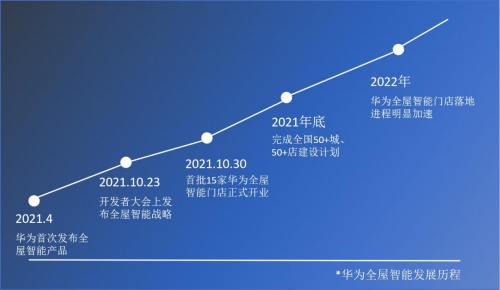 在全屋智能战略和门店方面,华为进入了加速布局阶段。2021年4月首次发布全屋智能产品,10月23日发布全屋智能战略,10月30日,首批15家华为全屋智能门店正式开业。2021年底,基本上完成全国50+城、50+店建设计划。