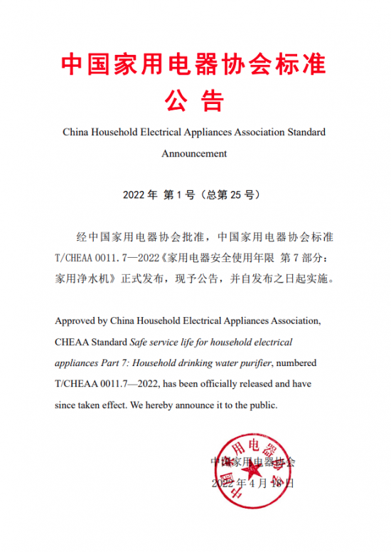 值得一提的是,净水机安全使用年限标准是家电安全年限系列标准的重要组成部分。2020年中国家用电器协会在国务院有关部门的指导下,制定并发布了《家用电器安全使用年限》系列标准,涵盖冰箱、洗衣机和干衣机、空调、燃气灶、吸油烟机、储水式电热水器六大品类八个产品。今年,净水机安全使用年限标准作为该系列标准的第7大类。在徐东生看来,系列标准的发布实施在推动家电更新升级、畅通资源循环利用、帮助消费者树立科学合理的消费观念等多个方面起到积极意义。