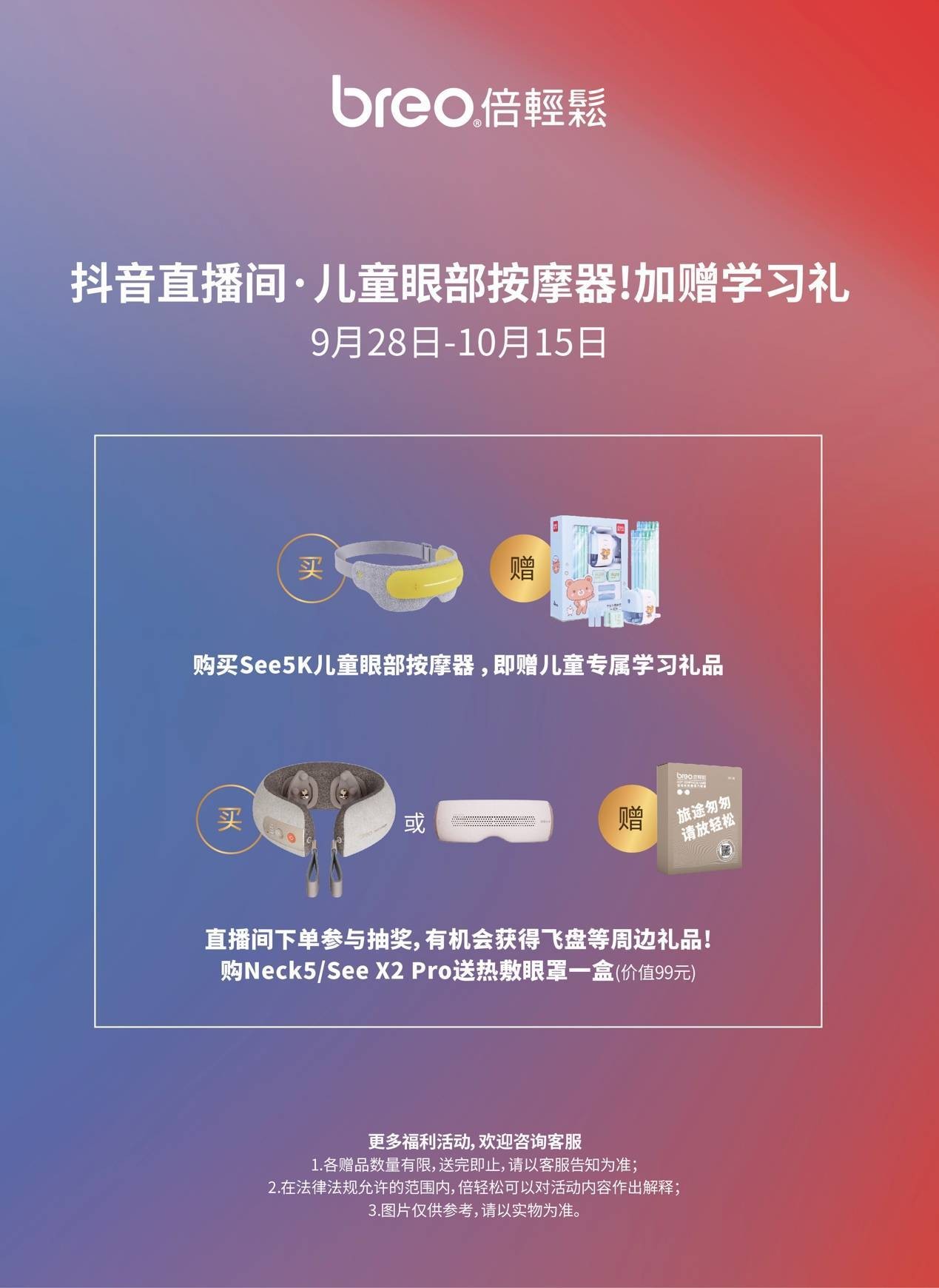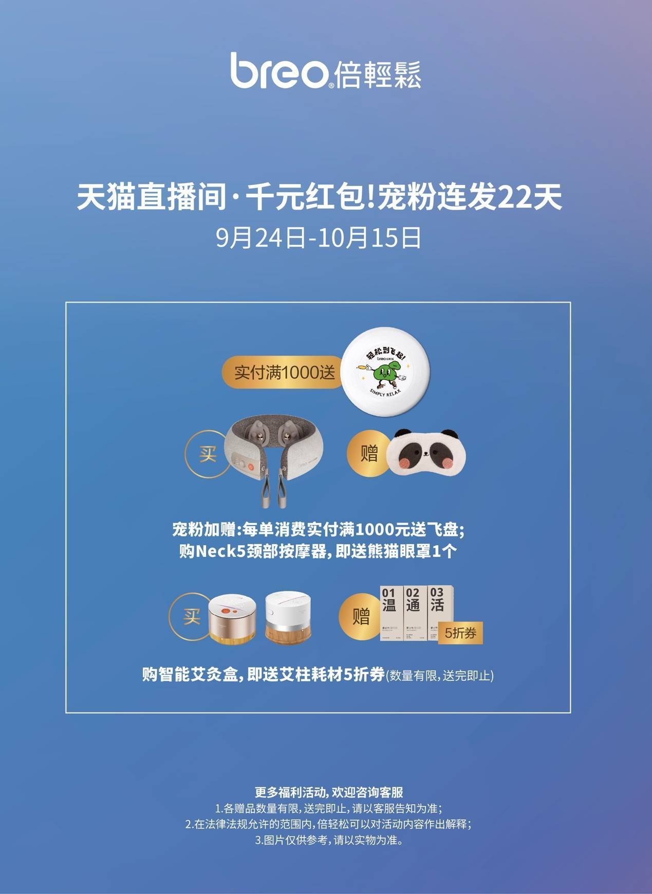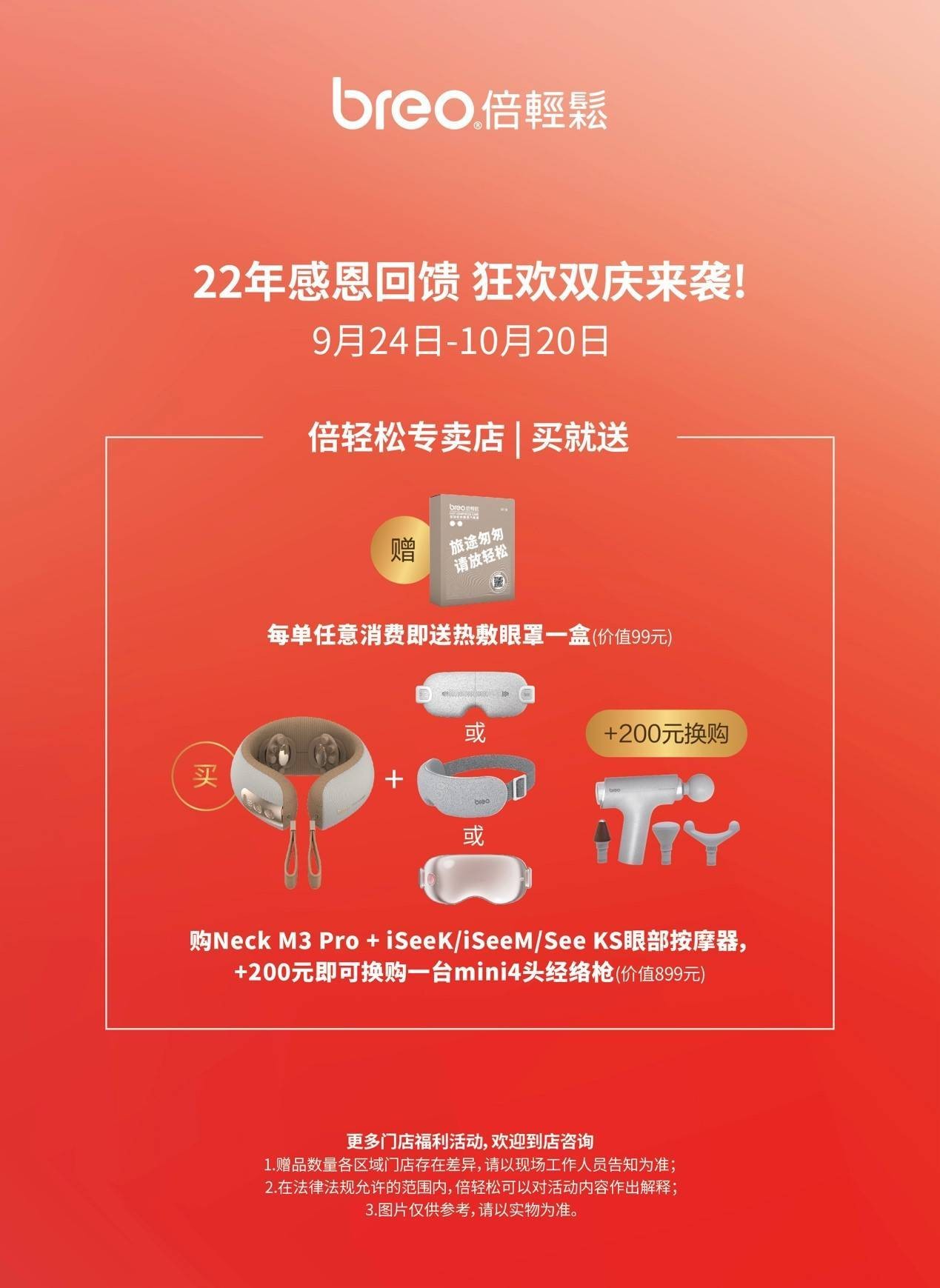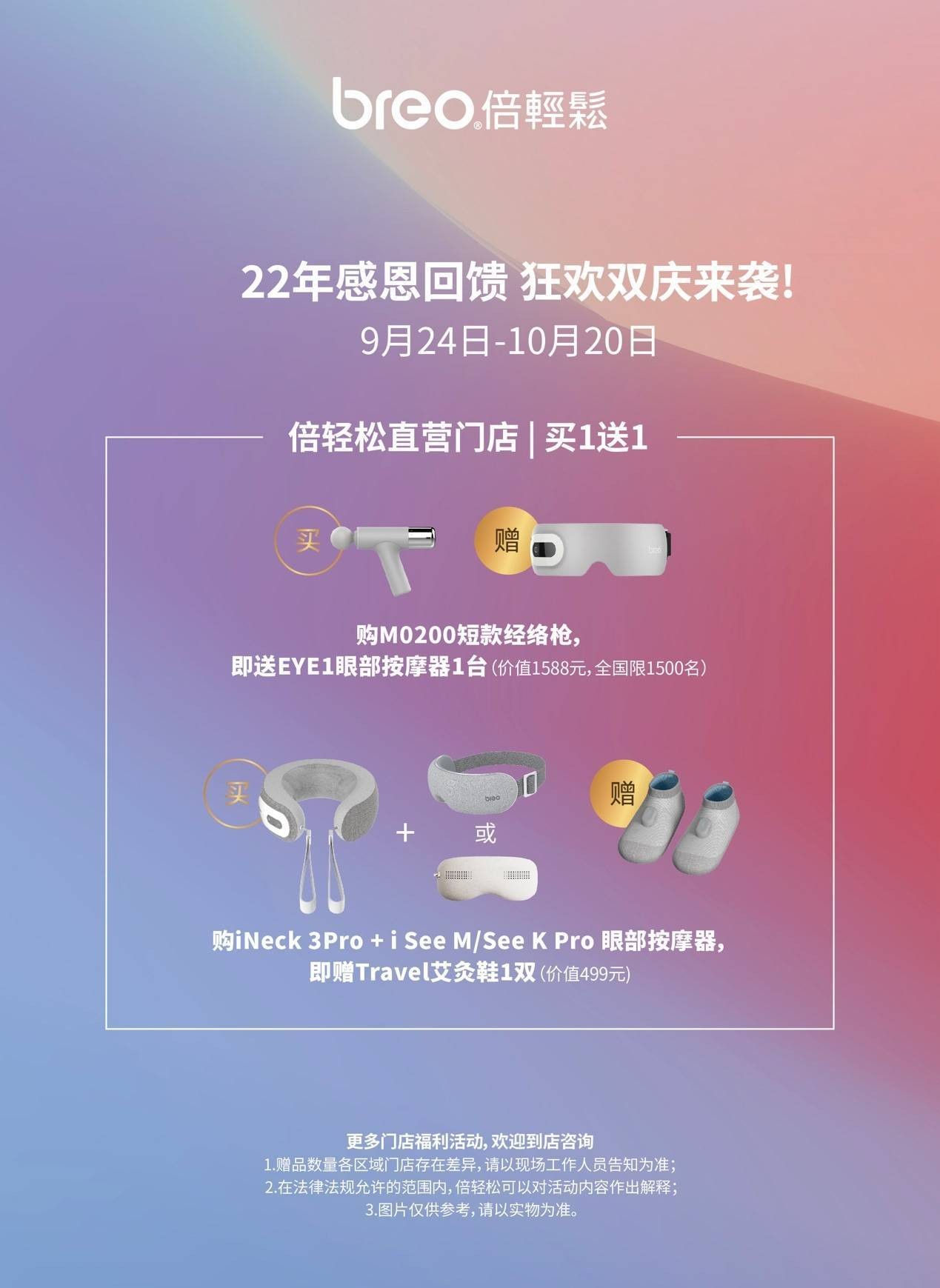 在22周年店庆和See K Pro冷热眼部按摩器新品上市的重要时刻,倍轻松为回应广大消费者信赖,还推出了感恩回馈活动。9月24日-10月20日,倍轻松直营门店全面开启“买1送1”的优惠活动。购买M0200短款经络枪,即享买1送1活动,获赠EYE1眼部按摩器;购买iNeck 3Pro颈部按摩器+iSee M/See K Pro眼部按摩器,可获赠价值499元的Travel艾灸鞋一双。倍轻松专卖店也同步开启“买就送,福利购”活动,还有更多门店福利活动,欢迎消费者到店咨询。