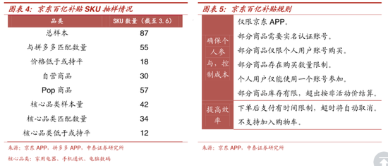 从商家端来说,入驻拼多多多是清库存,而入驻淘宝与京东多是以利润为首要目的。而京东为了不影响自营体系,在商家上更倾向于pop。中泰证券3月初的一次抽样调查显示,pop商品占据京东百亿补贴近三分之二的份额。