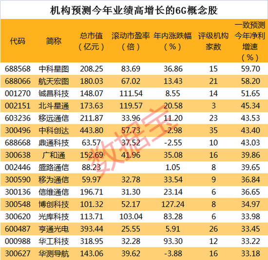 证券时报·数据宝统计,6G指数成份股共33只,涉足6G技术的研究及实验。中兴通讯(38.070, 0.77, 2.06%)涉及移动通信、固定网络、云计算等多个领域,包括6G技术的研究和实验;中国卫通(22.860, 1.70, 8.03%)在提供传统的C、Ku频段资源的同时,着力发展Ka频段高通量卫星系统;国脉科技(8.420, 0.10, 1.20%)是国内专业的通信网络技术服务商。