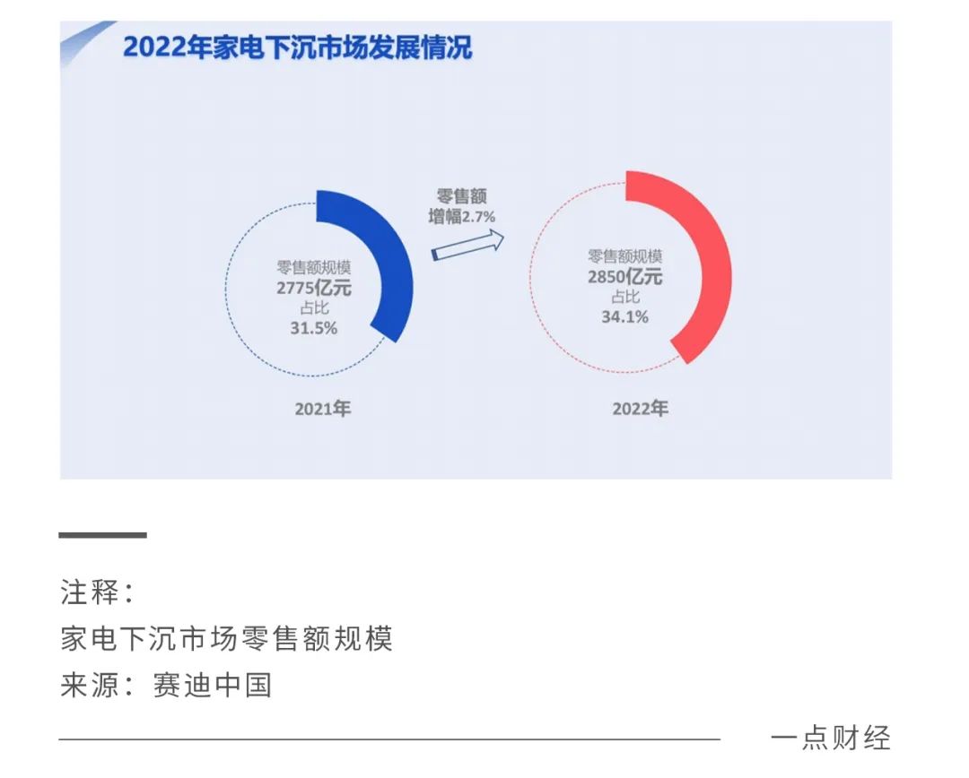 聚焦到家电领域,赛迪中国发布的《2022年中国家电市场报告》数据显示,2022年下沉家电市场逆势微增,零售额达到2850 亿元,比上年增长2.7%,家电零售额占整体家电市场的比例由 31.5% 提升至 34.1%。