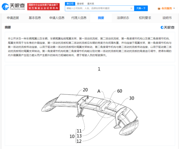 该专利的摘要信息显示,该专利涉及一种车辆尾翼以及车辆,车辆尾翼包括尾翼支架、第一活动扰流板、第二活动扰流板、第一角度调节机构以及第二角度调节机构。第一角度调节机构和第二角度调节机构能分别对第一活动扰流板和第二活动扰流板的角度进行调节,使得车辆的内外侧翼面产生阻力差从而产生额外的转向力矩辅助转向,便于驾驶人员的驾驶操作。