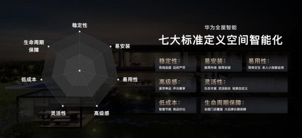 华为全屋智能在稳定性上,通过创新的PLC有线连接,保证了99.99%的稳定性;在安装方便性上,采用PLC通讯的方式取代了复杂的弱电布线,使得布线变得简单,使得全屋智能主机更加小巧不占地方,节省了成本和空间;在易用性上,多种交互设备操作简单,无论是老人还是小孩都能轻松使用;在高级感上,智能开关蒙德里安、智能MINI Pro,以及丰富的照明、遮阳、影音子系统,打造了极致的感官盛宴;在灵活性上,1+2+N的拼接积木式架构,使得华为全屋智能可以不断扩展,常用常新;在成本上,通过PLC及AI传感等解决方案,既能节省布线,也能实现全链路投入可控又节能;在生命周期保障上,大品牌保障,一次智能装修,让你放心无忧。