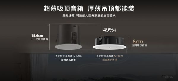 在这次发布会上,华为全屋智能还推出了超薄吸顶音箱、群控调光驱动器等产品,提升了声光氛围和交互体验。其中,超薄吸顶音箱只有8cm的超薄音腔设计,比现在的吸顶音箱薄了一半,只需要90mm的嵌墙深度就能安装,适合平吊等多样化的安装场景。而且,它还可以和华为全屋智能吸顶音箱搭配使用,适应各种户型和吊装场景。