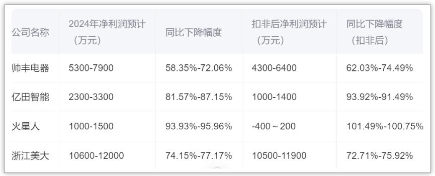 这四份业绩预告,已经是2024年以来集成灶行业传递的第四次坏消息。之前三份,分别是一季报、半年报、三季报的连连下滑。根据这份净利预告,扣非净利降幅达最低的都在60%以上,个别企业甚至净利下滑100%。目前2024年的营收业绩尽管还未公布,但据此不难推出“暴跌”或“重挫”的局面。