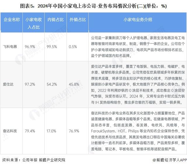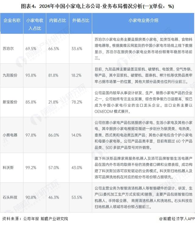 在小家电产业 - 整体制造的上市公司中,苏泊尔以厨房类小家电为主,市场份额常年稳居厨房类小家电前三 ; 九阳股份产品涵盖豆浆机、破壁机等,其豆浆机等优势品类占据市场第一,多数品类位列行业前三 ;新宝股份是出口龙头,出口业务以 OEM/ODM 模式为主 ;小熊电器产品品类丰富,涵盖 60 多个品类、500 多款型号的创意小家电 ; 科沃斯旗下科沃斯品牌家用服务机器人和添可品牌智能生活电器表现出色,扫地机器人和洗地机在细分市场份额领先 ;石头科技主营智能清洁机器人等,扫地机器人市场份额前三 ; 飞科电器专注个人护理等电器,电动剃须刀等产品在个护领域市场份额前五 ;爱仕达产品多样,将炊具技术嫁接到小家电研发,推出多款受认可产品 ; 奋达科技小家电业务涵盖健康电器、多媒体音箱等,美发电器出口额领先,与多家知名企业合作。各企业在小家电业务占比、内外销占比上也存在差异,如飞科电器内销占比高达 99.5%,新宝股份、奋达科技外销占比则分别为 78.2%、76.9%。