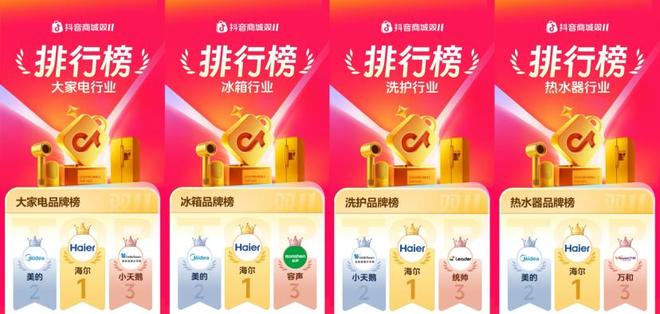 其中,海尔拿下大家电品牌榜TOP1,以及冰箱、洗衣机、热水器三大核心品类榜单TOP1,锁定大家电内容电商赛道第一。这不仅是海尔产品力、品牌力的集中爆发,更印证了2025年双11“价值战升级”的核心趋势:充分发挥爆款产品优势,通过内容种草升级与创新用户交互方式,拉动品牌的新增长。