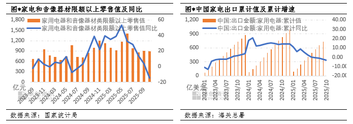 外需方面,据海关总署数据显示,2025年1-10月,中国家电出口累计809亿美元,同比下降3.4%。单月来看,2025年4月份开始,我国家电出口同比下滑,打破了2023年以来的复苏态势,短期压力集中,美国对中加征关税后,中国出口至美成本上升,叠加海外通胀下需求收缩压制出口增速。长期来看,全球家电需求的稳定替换属性为出口提供基础;中国企业通过海外建厂、渠道拓展、品牌化运营对冲贸易壁垒;完整的产业链布局与成本控制能力形成持续竞争优势,出口有望逐步回归平稳。
