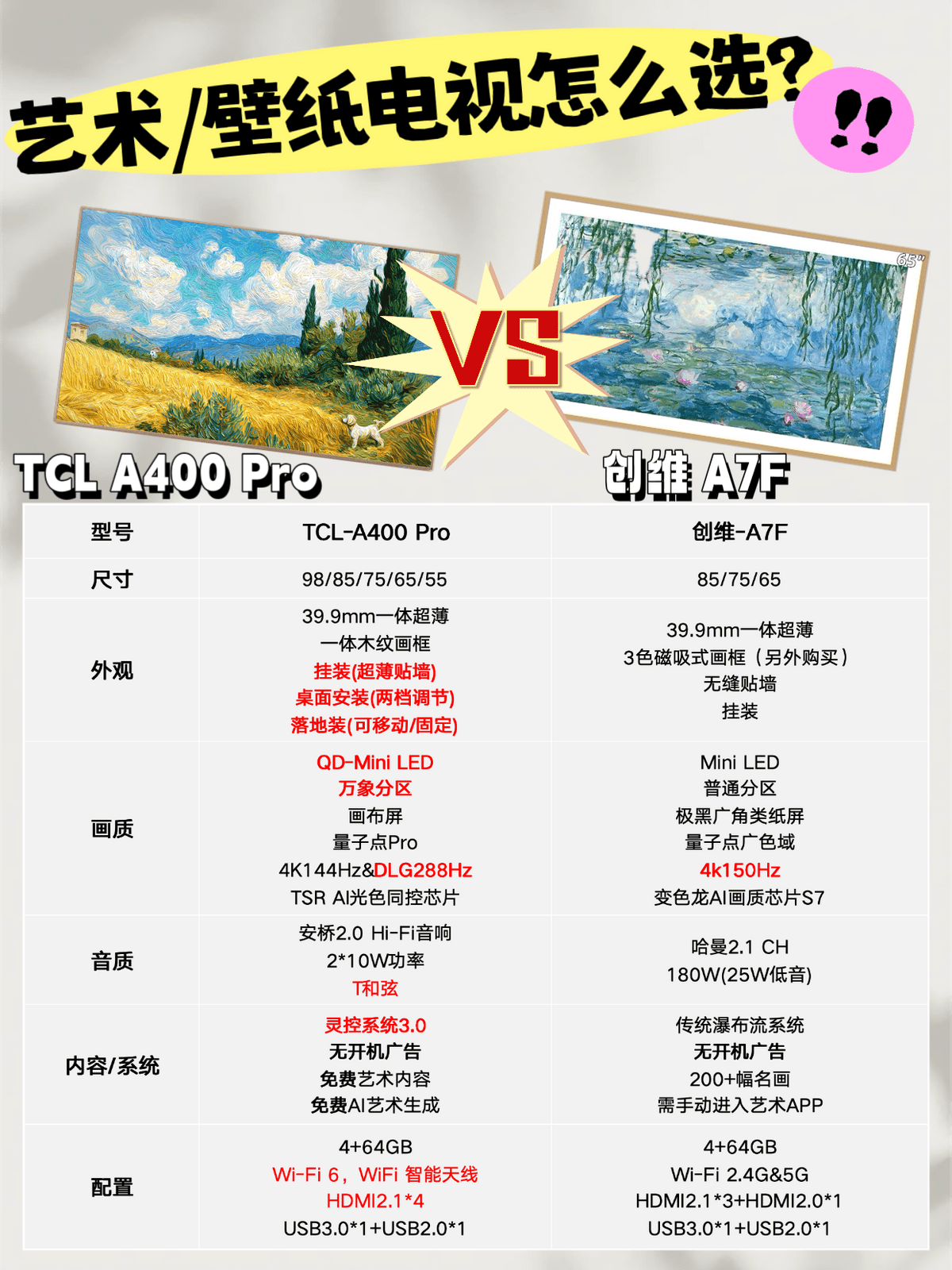 最后给大家做个总结:虽然同属热门艺术电视,但TCL A400 Pro与创维A7F的核心定位差异显著,分别适配不同的用户需求。如果你希望拥有一台“能移动、高颜值、高画质、多场景适配”的全能型艺术电视,既要兼顾日常高画质追剧、艺术欣赏,还要满足亲子互动、全屋娱乐甚至游戏竞技的需求,那么TCL A400 Pro显然是更全面、更具前瞻性的选择。更多对比信息感兴趣的朋友详看下图。