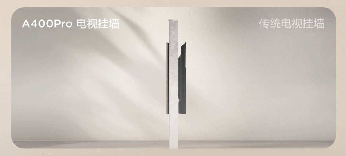 对艺术电视而言,能否自然融入家装风格,外观设计与安装灵活度无疑是第一道“门槛”。传统电视“背包式”的厚重机身,挂墙后总会与墙面留下一道尴尬的缝隙,瞬间拉低空间整体质感。在这一点上,TCL A400 Pro和创维A7F都达到了行业领先水平——机身厚度均控制在39.9mm,轻薄得宛如精致画框,挂墙后就像一幅精心装裱的艺术品悬浮于墙面,精准契合了极简主义对“隐形家电”的极致追求。