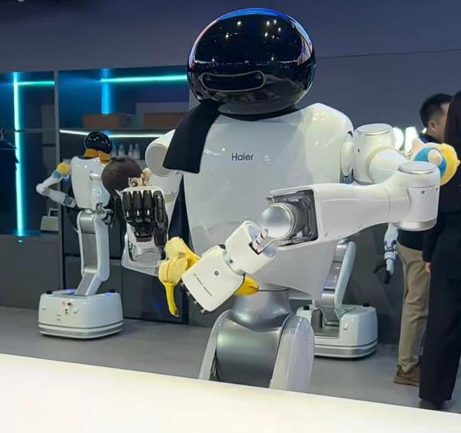 现场,海尔无界生态智慧生活馆内人头攒动,沉浸式的智慧生活场景让人惊叹:机器人“海娃”正在剥香蕉,薄薄的果皮剥下,内里完好无损;另一边,机器人将不同食材拎到冰箱门前,把饮料放入冷藏区、冰激凌放进冷冻区,冰箱同步匹配保鲜程序;洗衣服也全程不用人插手,机器人自主将脏衣物放进洗衣机,洗完后再自动挪到烘干机里……