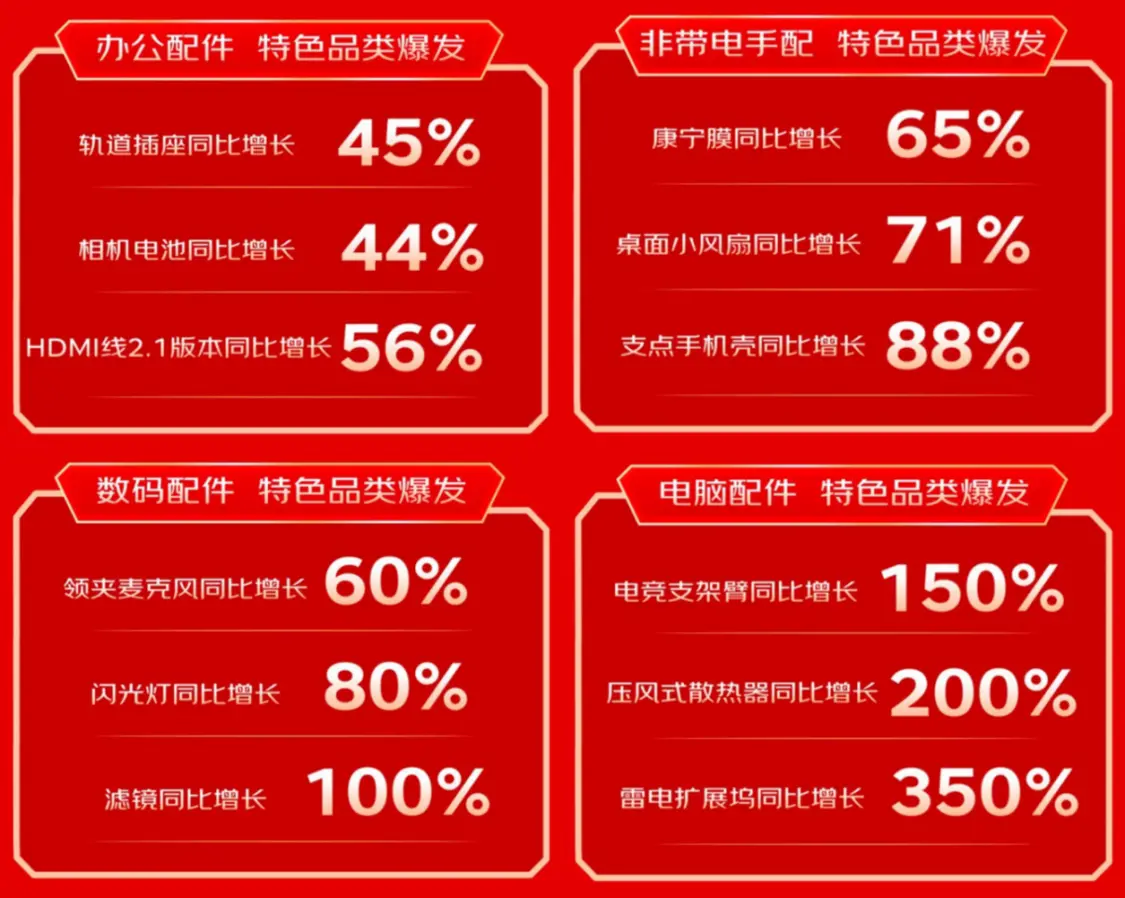此外,在办公配件特色品类中,HDMI线2.1版本成交额同比增长56%,轨道插座成交额同比增长45%;非带电手机配件特色品类中,支点手机壳成交额同比增长88%,桌面小风扇成交额同比增长71%,成为夏日清凉利器;随着短剧、短视频的持续爆火,数码配件品类中滤镜成交额同比增长100%,闪光灯成交额同比增长80%,助力传媒从业者乃至普通用户轻松打造爆款内容;电脑配件特色品类中,雷电扩展坞成交额同比增长350%,压风式散热器成交额同比增长200%,电竞支架臂成交额同比增长150%,高性价比配件助力玩家畅快释放技能!