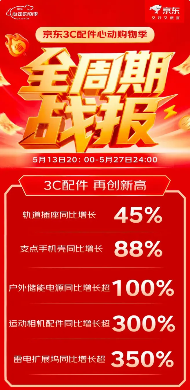 自京东心动购物季5月13日晚8点开启以来,诚意补贴优惠加上丰富的品质好物,引发众多消费者涌入京东焕新购买。京东3C配件战报数据显示,截至5月27日24点,雷电扩展坞成交额同比增长超350%,运动相机配件成交额同比增长超300%,户外储能电源成交额同比增长超100%。京东心动购物季以多项亮眼战绩,再次展现出又好又便宜的3C配件对消费者的强大吸引力,持续促进3C配件品类快速增长。