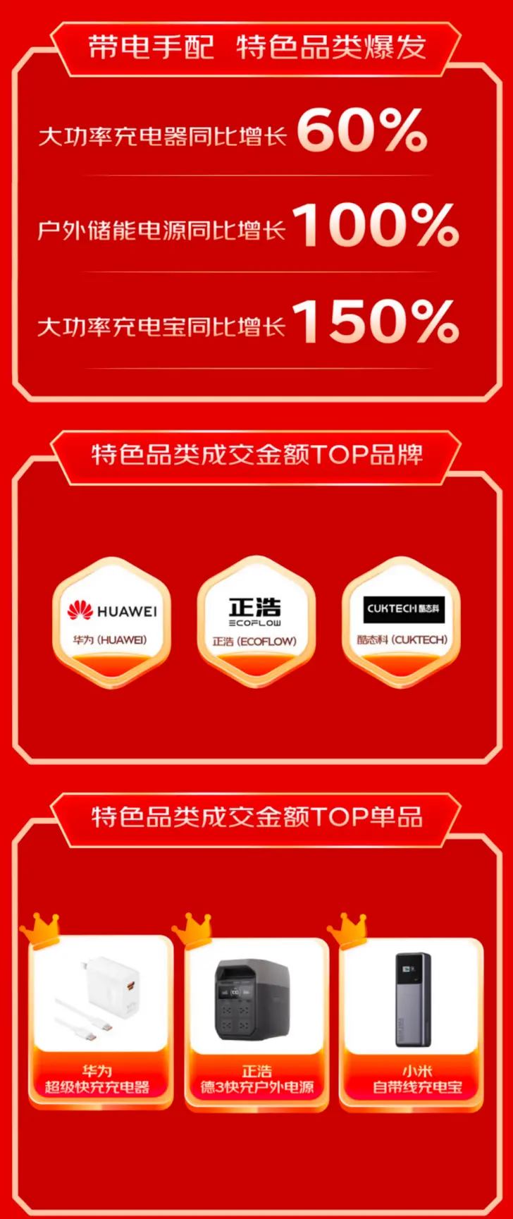 京东心动购物季期间,各具特色的3C数码配件迎来全面爆发。在带电手配特色品类中,大功率充电宝成交额同比增长150%,户外储能电源成交额同比增长100%;华为、正浩、酷态科斩获特色品类成交额TOP品牌;该品类成交金额TOP单品则被华为超级快充充电器、正浩德3快充户外电源、小米自带线充电宝包揽。