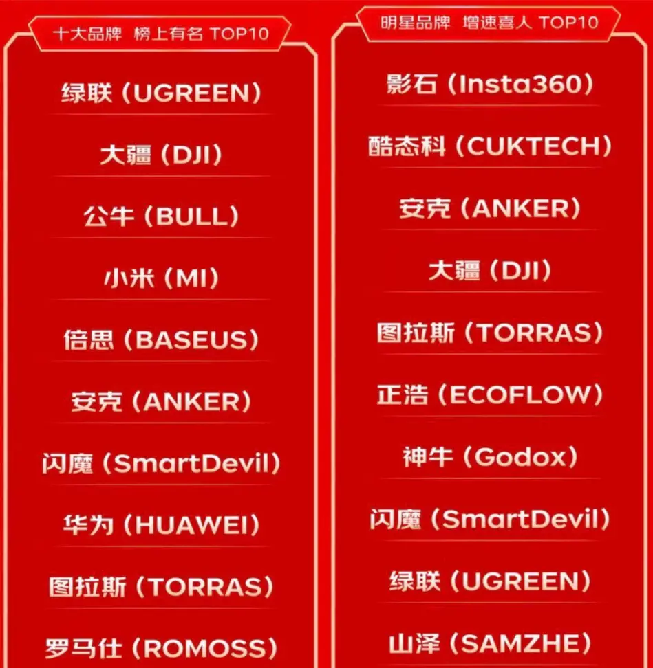 与此同时,在品牌层面,京东心动购物季期间助力合作伙伴实现新增长。其中,绿联、大疆、公牛凭借亮眼战绩位列品牌榜前三甲;影石、酷态科、安克等十大明星品牌增速表现亮眼;TELESIN、Smorss、飞智等新兴品牌则迎来爆发式增长,未来可期。