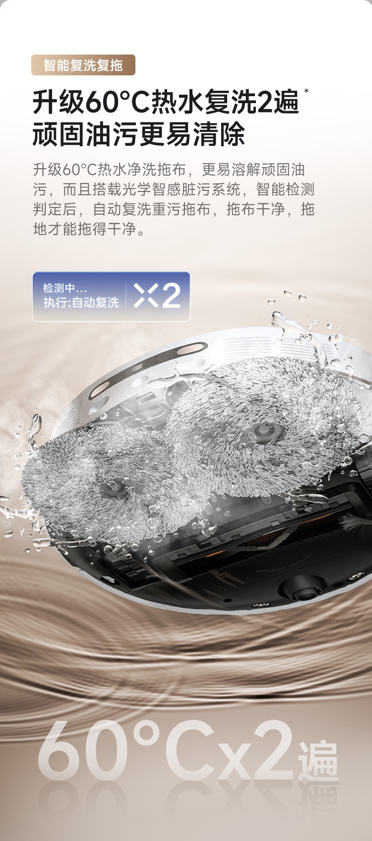 厨房、餐厅等是家庭油污聚集的重地。在扫地机器人对地面油污进行彻底清洁之后,如果不及时对拖布进行清洁,容易形成顽固油污。追觅S10 Pro Ultra机械臂版采用60℃ 热水洗拖布方案,用热水自清洁加速软化顽固油污。全能基站将水温加热至60℃,提高清洁液中活性剂的去污效果,将拖布中的油污、色素等顽固残留轻松瓦解。