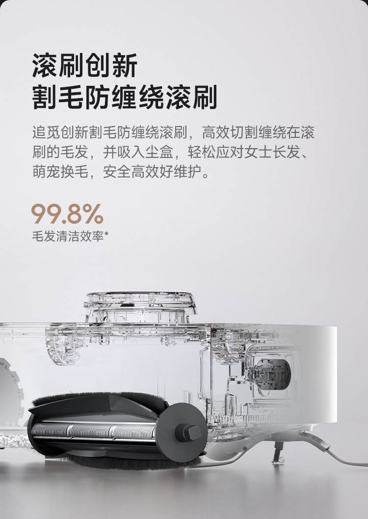 7300Pa强大吸力持久稳定,行业首创主动式割毛防缠绕滚刷,毛发清洁无忧