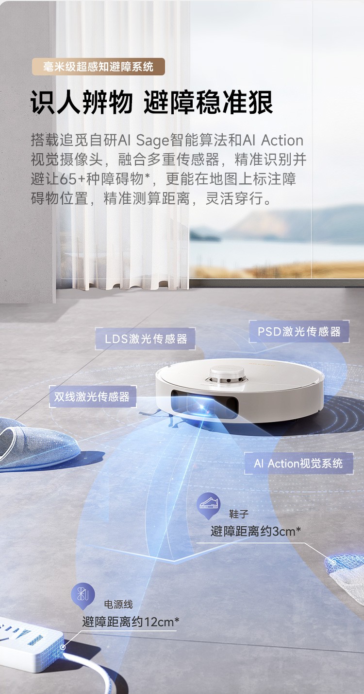 AI Action视觉摄像头+双线激光打造毫米级超感知避障,搭载无人驾驶引擎,完成家庭深度清洁