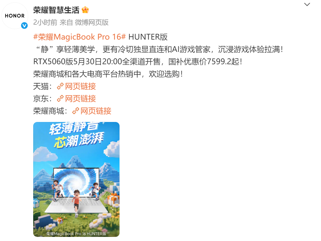 5月30日,荣耀MagicBook Pro 16 HUNTER版2025迎来新成员,搭载RTX5060显卡的版本正式上市,为追求轻薄静音游戏体验的用户提供更多选择,将成为今年618最值得关注的5060游戏本。5月30日晚8点,RTX5060版全平台开售,提供Ultra9 285H和Ultra5 225H两种配置机型,国补到手价7599.2元起。