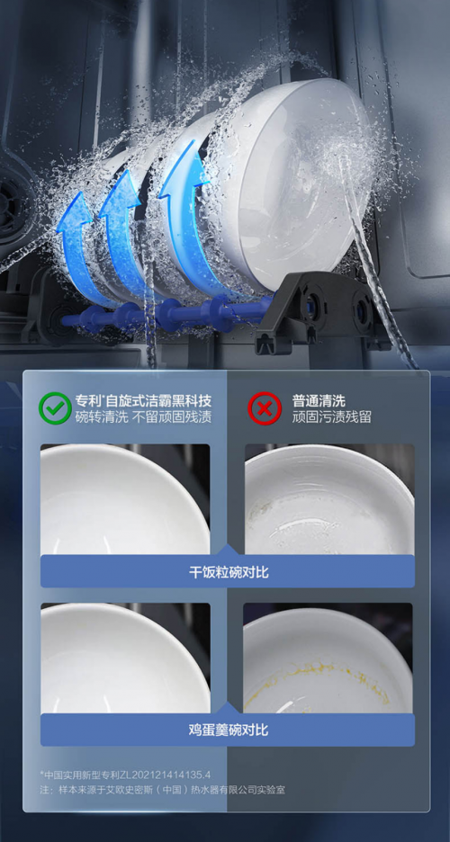 与传统的洗碗机相比,A.O.史密斯自旋式洁霸洗碗机除了在常规的“洗、烘、消、存”等方面的表现均相当突出之外,由于搭载了专利的自旋式洁霸黑科技,三层喷淋系统密布着34个强劲喷射的喷孔,能真正做到360°冲刷无死角。在清洗过程中,它可以将“自旋专区”的碗进行多次自动旋转,直至每个角落都直面强劲水流,连令人头疼的干饭粒、鸡蛋羹也能轻松一次洗净,彻底清除餐后污渍残留。