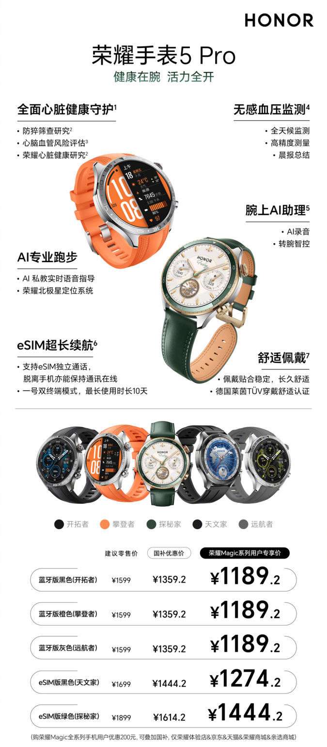 荣耀手表5 Pro自9月25日全渠道启动预售以来,市场反响热烈,上市初期一度全渠道售罄,出现断货的热销盛况。10月23日,荣耀手表5 Pro正式开启首销,有蓝牙和eSIM两个版本可选,其中蓝牙版本,攀登者(橙色)、开拓者(黑色)、远航者(灰色)首销国补优惠价1359.2元。eSIM版本,天文家(黑色)首销国补优惠价1444.2元,探秘家(绿色)首销国补优惠价1614.2元。首销期荣耀Magic系列用户,攀登者、开拓者、远航者专享国补优惠价1189.2元,天文家专享国补优惠价1274.2元,探秘家专享国补优惠价1444.2元。