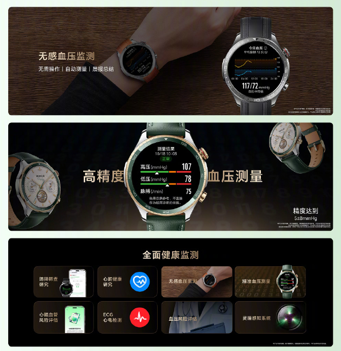 荣耀手表5 Pro作为荣耀手表最新的旗舰级智能产品,带来了健康监测管理的重大升级,率先支持全天无感血压监测,让用户无需手动操作即可完成血压监测,每日晨间自动生成血压晨报总结,开启腕上血压管理新时代。除了全天无感血压监测,荣耀手表5 Pro还提供不校准无感风险评估,支持校准后单次测量,精准血压测量出值,让血压监测不再模糊不清,更加精准可靠,测量结果一目了然,带来全面领先的血压监测管理的全新体验。荣耀手表5 Pro支持24小时监测用户心脏状态,对疑似房颤、疑似早搏、疑似睡眠呼吸暂停、防猝筛查进行风险筛查预警,全天候守护用户健康。
